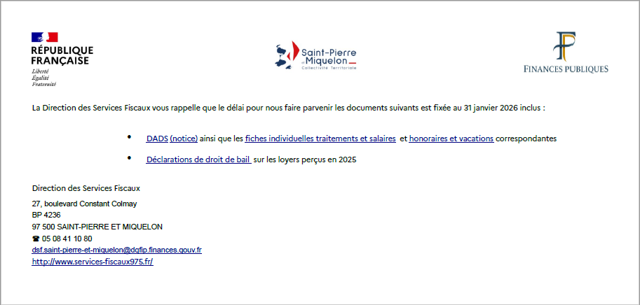 La Direction des Services Fiscaux vous rappelle que le délai pour nous faire parvenir les documents suivants est fixée au 31 janvier 2026 inclus (cliquez sur les liens) :